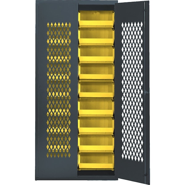 Specialty Bin Cabinets, heavy-duty, mesh door model, 36''W x 18''D x 78''H, Includes: 18 14-3/4''L x 16-1/2''W x 7''H QUS250 yellow bin, 14-gauge all welded construction, gray finish, ships assembeled
