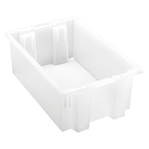 Stacking and Nesting Tote, Container Wall Type Solid, Fork Pockets Fork Pockets Not Included, Includes Lid Lid Not Included, Material Plastic, Maximum Operating Temperature 135 Degrees F, Minimum Operating Temperature -20 Degrees F, Body Color Clear, Nestable Nesting Capable, Overall Height 6 in, Overall Length 18 in, Overall Width 11 in, Resistant To Chemical, Corrosion, Water, Stackable Stacking Capable, Stacking Capacity 100 lb, Volume Capacity 3.7 gal, Weight Capacity 45 lb