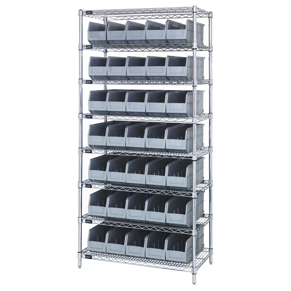 Combination of stackable shelf bins on to a wire shelving unit as one complete package. The stackable shelf bin is a hybrid bin combining the stacking characteristics of an Ultra bin and the light duty characteristics of a shelf bin. These bins work perfectly in a wire shelving unit.