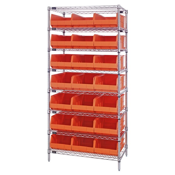 Combination of stackable shelf bins on to a wire shelving unit as one complete package. The stackable shelf bin is a hybrid bin combining the stacking characteristics of an Ultra bin and the light duty characteristics of a shelf bin. These bins work perfectly in a wire shelving unit.