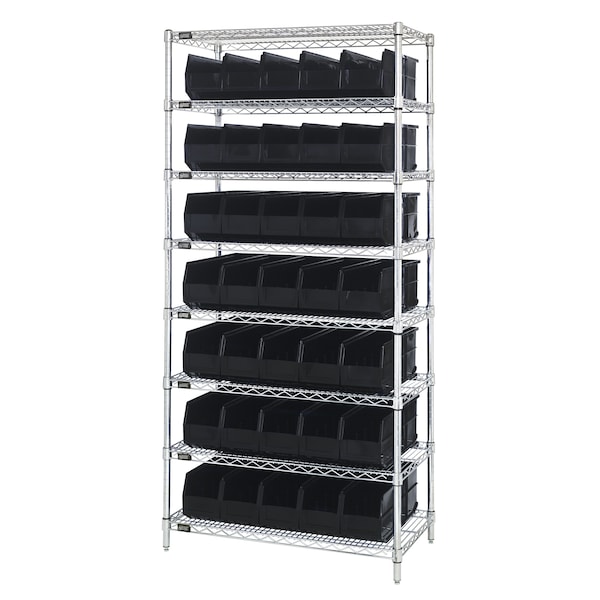 Combination of stackable shelf bins on to a wire shelving unit as one complete package. The stackable shelf bin is a hybrid bin combining the stacking characteristics of an Ultra bin and the light duty characteristics of a shelf bin. These bins work perfectly in a wire shelving unit.