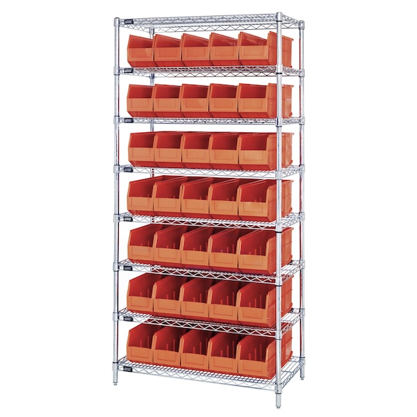 Combination of stackable shelf bins on to a wire shelving unit as one complete package. The stackable shelf bin is a hybrid bin combining the stacking characteristics of an Ultra bin and the light duty characteristics of a shelf bin. These bins work perfectly in a wire shelving unit.