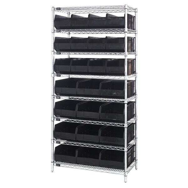 Combination of stackable shelf bins on to a wire shelving unit as one complete package. The stackable shelf bin is a hybrid bin combining the stacking characteristics of an Ultra bin and the light duty characteristics of a shelf bin. These bins work perfectly in a wire shelving unit.