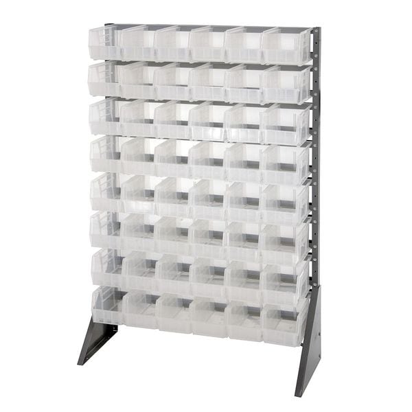 Bin Rail Floor Rack, Clear Bin Color, Bin HxWxD (48) 5 in x 5 1/2 in x 10 7/8 in, Hang and Stack, Polypropylene, Number of Bins 48, Overall Depth 15 in, Overall Height 54 in, Overall Width 36 in, Rack Color Gray, Rail Finish Powder Coated, Rail Material Steel, ESD Conductive No, Frame Material Steel, (48) Mfr. No. QUS230CL, Number of Usable Sides 1, Load Capacity per Rail 75 lb, Whole Unit Load Capacity 600 lb