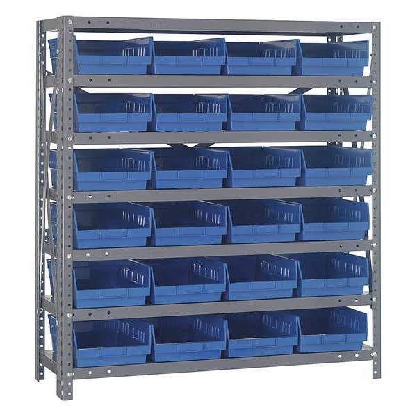Bin Shelving, Bin Style Shelf, Bin Material Polypropylene, (24) 4 in x 8 3/8 in x 11 5/8 in Bin HxWxD, Bin Height 4 in, Bin Front Type Open, Bin Depth 11 5/8 in, Bin Color Blue, Frame Material Steel, NSF, Frame Color Gray, Powder Coated, Includes Bins Yes, Bin Width 8 3/8 in, Includes QSB107BL, Load Capacity per Shelf 400 lb, Number of Bins 24, Number of Shelves 7, Number of Usable Sides 1, Overall Depth 12 in, Overall Height 39 in, Overall Width 36 in, Powder Coated Shelf Finish