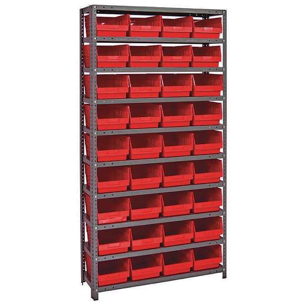 Bin Shelving, Bin Style Shelf, Bin Material Polypropylene, (36) 6 in x 8 3/8 in x 11 5/8 in Bin HxWxD, Bin Height 6 in, Bin Front Type Open, Bin Depth 11 5/8 in, Bin Color Red, Frame Material Steel, NSF, Frame Color Gray, Powder Coated, Includes Bins Yes, Bin Width 8 3/8 in, Includes QSB207RD, Load Capacity per Shelf 400 lb, Number of Bins 36, Number of Shelves 10, Number of Usable Sides 1, Overall Depth 12 in, Overall Height 75 in, Overall Width 36 in, Powder Coated Shelf Finish