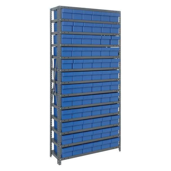 Bin Shelving, Bin Style Drawer, Bin Material Polystyrene, (72) 4 5/8 in x 5 9/16 in x 11 5/8 in Bin HxWxD, Bin Height 4 5/8 in, Bin Front Type Closed, Bin Depth 11 5/8 in, Bin Color Blue, Frame Material Steel, NSF, Frame Color Gray, Powder Coated, Includes Bins Yes, Bin Width 5 9/16 in, Includes QED601, Load Capacity per Shelf 400 lb, Number of Bins 72, Number of Shelves 13, Number of Usable Sides 1, Overall Depth 12 in, Overall Height 75 in, Overall Width 36 in, Powder Coated Shelf Finish