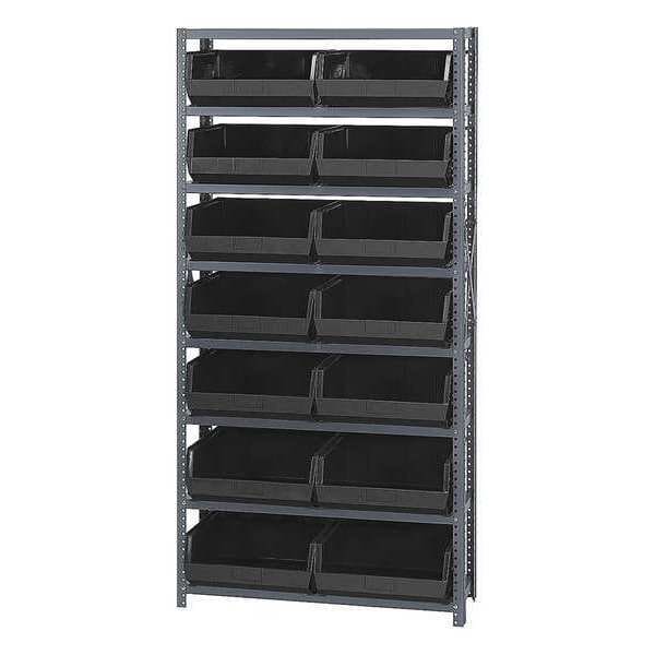 Bin Shelving, Bin Style Hang and Stack, Bin Material Polypropylene, (14) 7 in x 16 1/2 in x 14 3/4 in Bin HxWxD, Bin Height 7 in, Bin Front Type Open, Bin Depth 14 3/4 in, Bin Color Black, Frame Material Steel, FDA Approved, Frame Color Gray, Powder Coated, Includes Bins Yes, Bin Width 16 1/2 in, Load Capacity per Shelf 400 lb, Number of Bins 14, Number of Shelves 8, Number of Usable Sides 1, Overall Depth 12 in, Overall Height 75 in, Overall Width 36 in, Powder Coated Shelf Finish