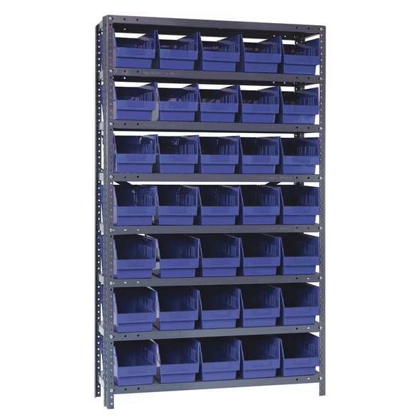Bin Shelving, Bin Style Shelf, Bin Material Polypropylene, (35) 8 in x 6 5/8 in x 11 5/8 in Bin HxWxD, Bin Height 8 in, Bin Front Type Open, Bin Depth 11 5/8 in, Bin Color Blue, Frame Material Steel, NSF, Frame Color Gray, Powder Coated, Includes Bins Yes, Bin Width 6 5/8 in, Includes QED802BL, Load Capacity per Shelf 400 lb, Number of Bins 35, Number of Shelves 8, Number of Usable Sides 1, Overall Depth 12 in, Overall Height 75 in, Overall Width 36 in, Powder Coated Shelf Finish