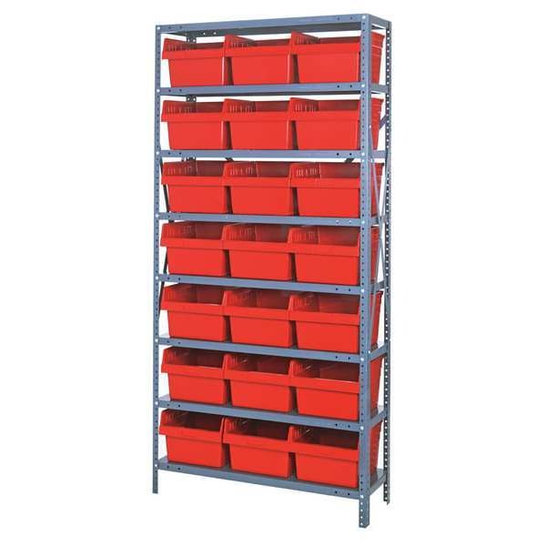 Bin Shelving, Bin Style Shelf, Bin Material Polypropylene, (21) 8 in x 11 1/8 in x 11 5/8 in Bin HxWxD, Bin Height 8 in, Bin Front Type Open, Bin Depth 11 5/8 in, Bin Color Red, Frame Material Steel, NSF, Frame Color Gray, Powder Coated, Includes Bins Yes, Bin Width 11 1/8 in, Includes QSB809RD, Load Capacity per Shelf 400 lb, Number of Bins 21, Number of Shelves 8, Number of Usable Sides 1, Overall Depth 12 in, Overall Height 75 in, Overall Width 36 in, Powder Coated Shelf Finish