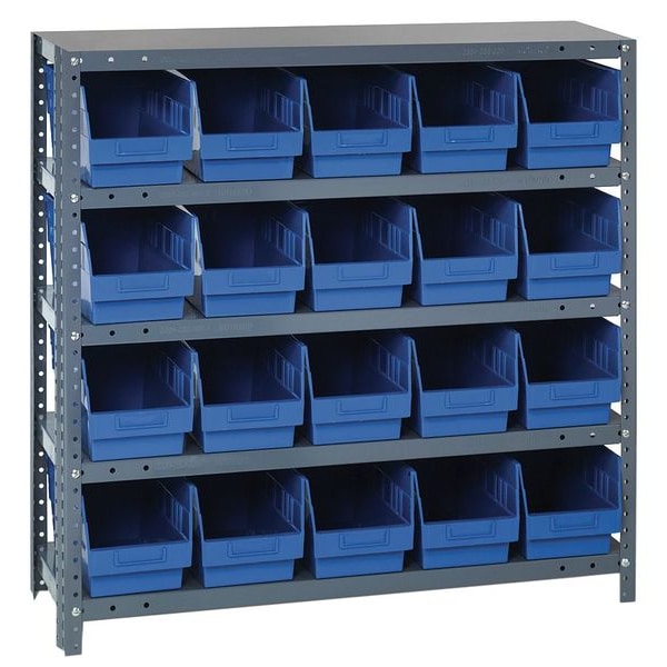 Bin Shelving, Bin Style Shelf, Bin Material Polypropylene, (20) 6 in x 6 5/8 in x 17 7/8 in Bin HxWxD, Bin Height 6 in, Bin Front Type Open, Bin Depth 17 7/8 in, Bin Color Blue, Frame Material Steel, NSF, Frame Color Gray, Powder Coated, Includes Bins Yes, Bin Width 6 5/8 in, Includes QSB204BL, Load Capacity per Shelf 400 lb, Number of Bins 20, Number of Shelves 5, Number of Usable Sides 1, Overall Depth 18 in, Overall Height 39 in, Overall Width 36 in, Powder Coated Shelf Finish