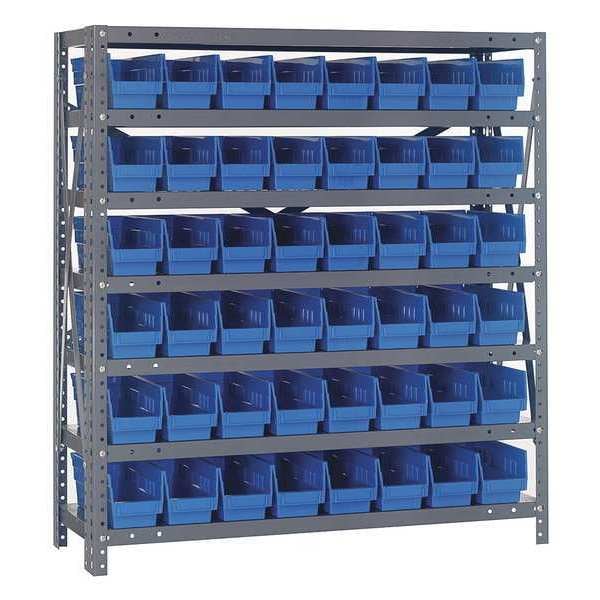 Bin Shelving, Bin Style Shelf, Bin Material Polypropylene, (48) 4 in x 4 1/8 in x 17 7/8 in Bin HxWxD, Bin Height 4 in, Bin Front Type Open, Bin Depth 17 7/8 in, Bin Color Blue, Frame Material Steel, NSF, Frame Color Gray, Powder Coated, Includes Bins Yes, Bin Width 4 1/8 in, Includes QSB103BL, Load Capacity per Shelf 55 lb, Number of Bins 48, Number of Shelves 7, Number of Usable Sides 1, Overall Depth 18 in, Overall Height 39 in, Overall Width 36 in, Powder Coated Shelf Finish