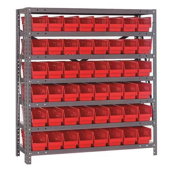Bin Shelving, Bin Style Shelf, Bin Material Polypropylene, (48) 4 in x 4 1/8 in x 17 7/8 in Bin HxWxD, Bin Height 4 in, Bin Front Type Open, Bin Depth 17 7/8 in, Bin Color Red, Frame Material Steel, NSF, Frame Color Gray, Powder Coated, Includes Bins Yes, Bin Width 4 1/8 in, Includes QSB103RD, Load Capacity per Shelf 55 lb, Number of Bins 48, Number of Shelves 7, Number of Usable Sides 1, Overall Depth 18 in, Overall Height 39 in, Overall Width 36 in, Powder Coated Shelf Finish