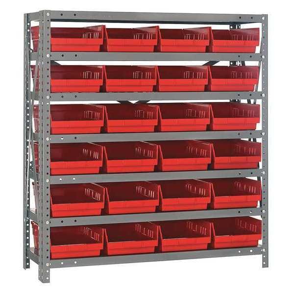 Bin Shelving, Bin Style Shelf, Bin Material Polypropylene, (24) 4 in x 8 1/8 in x 17 7/8 in Bin HxWxD, Bin Height 4 in, Bin Front Type Open, Bin Depth 17 7/8 in, Bin Color Red, Frame Material Steel, NSF, Frame Color Gray, Powder Coated, Includes Bins Yes, Bin Width 8 1/8 in, Includes QSB108RD, Load Capacity per Shelf 400 lb, Number of Bins 24, Number of Shelves 7, Number of Usable Sides 1, Overall Depth 18 in, Overall Height 39 in, Overall Width 36 in, Powder Coated Shelf Finish