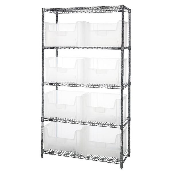 Bin Shelving, Bin Style Hang and Stack, Bin Material Polypropylene, (8) 12 7/16 in x 19 7/8 in x 15 1/4 in Bin HxWxD, Bin Height 12 7/16 in, Bin Front Type Open, Bin Depth 15 1/4 in, Bin Color Clear, Frame Material Steel, NSF, Frame Color Silver, Chrome, Includes Bins Yes, Bin Width 19 7/8 in, Includes QGH700CL, Load Capacity per Shelf 800 lb, Number of Bins 8, Number of Shelves 5, Number of Usable Sides 1, Overall Depth 18 in, Overall Height 74 in, Overall Width 42 in, Chrome Shelf Finish