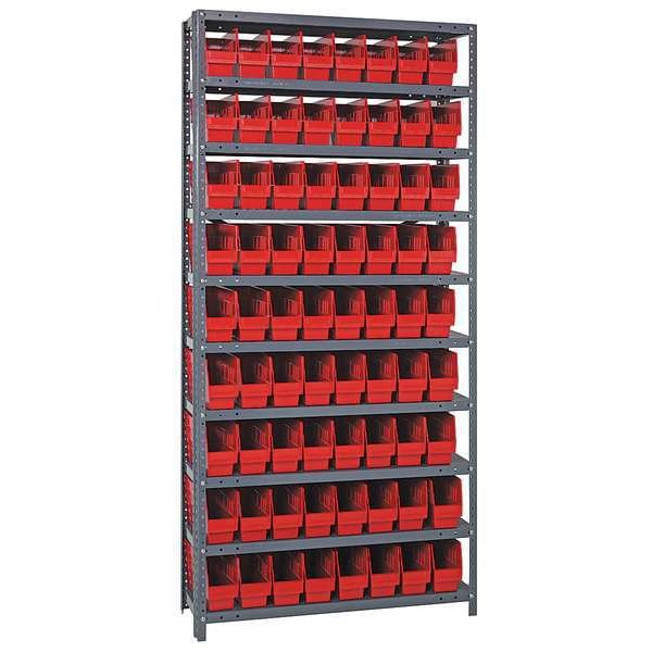 Bin Shelving, Bin Style Shelf, Bin Material Polypropylene, (72) 6 in x 4 1/8 in x 17 7/8 in Bin HxWxD, Bin Height 6 in, Bin Front Type Open, Bin Depth 17 7/8 in, Bin Color Red, Frame Material Steel, NSF, Frame Color Gray, Powder Coated, Includes Bins Yes, Bin Width 4 1/8 in, Includes QSB203RD, Load Capacity per Shelf 400 lb, Number of Bins 72, Number of Shelves 10, Number of Usable Sides 1, Overall Depth 18 in, Overall Height 75 in, Overall Width 36 in, Powder Coated Shelf Finish