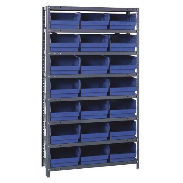 Bin Shelving, Bin Style Shelf, Bin Material Polypropylene, (21) 8 in x 11 1/8 in x 17 7/8 in Bin HxWxD, Bin Height 8 in, Bin Front Type Open, Bin Depth 17 7/8 in, Bin Color Blue, Frame Material Steel, NSF, Frame Color Gray, Powder Coated, Includes Bins Yes, Bin Width 11 1/8 in, Includes QSB809BL, Load Capacity per Shelf 400 lb, Number of Bins 21, Number of Shelves 8, Number of Usable Sides 1, Overall Depth 18 in, Overall Height 75 in, Overall Width 36 in, Powder Coated Shelf Finish