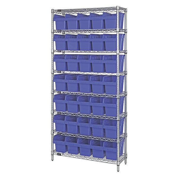 Bin Shelving, Bin Style Shelf, Bin Material Polypropylene, (35) 8 in x 6 5/8 in x 11 5/8 in Bin HxWxD, Bin Height 8 in, Bin Front Type Open, Bin Depth 11 5/8 in, Bin Color Blue, Frame Material Steel, FDA Approved, Frame Color Silver, Chrome, Includes Bins Yes, Bin Width 6 5/8 in, Load Capacity per Shelf 800 lb, Number of Bins 35, Number of Shelves 8, Number of Usable Sides 1, Overall Depth 36 in, Overall Height 74 in, Overall Width 12 in, Chrome Shelf Finish, Steel Shelf Material, No
