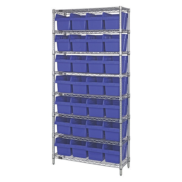 Bin Shelving, Bin Style Shelf, Bin Material Polypropylene, (28) 8 in x 8 3/8 in x 11 5/8 in Bin HxWxD, Bin Height 8 in, Bin Front Type Open, Bin Depth 11 5/8 in, Bin Color Blue, Frame Material Steel, FDA Approved, Frame Color Silver, Chrome, Includes Bins Yes, Bin Width 8 3/8 in, Load Capacity per Shelf 800 lb, Number of Bins 28, Number of Shelves 8, Number of Usable Sides 1, Overall Depth 36 in, Overall Height 74 in, Overall Width 12 in, Chrome Shelf Finish, Steel Shelf Material, No