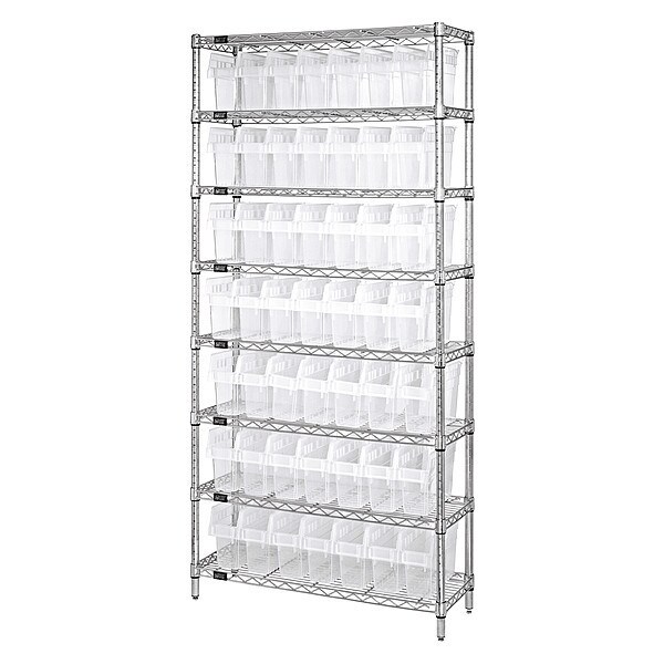 Bin Shelving, Bin Style Shelf, Bin Material Polypropylene, (56) 8 in x 4 3/8 in x 11 5/8 in Bin HxWxD, Bin Height 8 in, Bin Front Type Open, Bin Depth 11 5/8 in, Bin Color Clear, Frame Material Steel, FDA Approved, Frame Color Silver, Chrome, Includes Bins Yes, Bin Width 4 3/8 in, Load Capacity per Shelf 800 lb, Number of Bins 56, Number of Shelves 8, Number of Usable Sides 1, Overall Depth 36 in, Overall Height 74 in, Overall Width 12 in, Chrome Shelf Finish, Steel Shelf Material, No