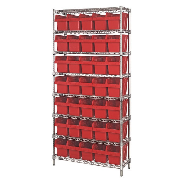 Bin Shelving, Bin Style Shelf, Bin Material Polypropylene, (35) 8 in x 6 5/8 in x 11 5/8 in Bin HxWxD, Bin Height 8 in, Bin Front Type Open, Bin Depth 11 5/8 in, Bin Color Red, Frame Material Steel, FDA Approved, Frame Color Silver, Chrome, Includes Bins Yes, Bin Width 6 5/8 in, Load Capacity per Shelf 800 lb, Number of Bins 35, Number of Shelves 8, Number of Usable Sides 1, Overall Depth 36 in, Overall Height 74 in, Overall Width 12 in, Chrome Shelf Finish, Steel Shelf Material, No