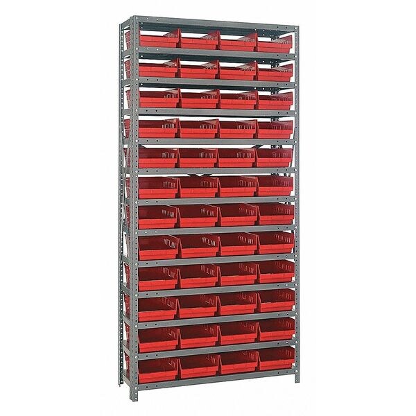 Bin Shelving, Bin Style Shelf, Bin Material Plastic, (48) 4 in x 8 3/8 in x 11 5/8 in Bin HxWxD, Bin Height 4 in, Bin Front Type Open, Bin Depth 11 5/8 in, Bin Color Red, Frame Material Steel, NSF, Frame Color Gray, Powder Coated, Includes Bins Yes, Bin Width 8 3/8 in, Includes QSB107RD, Load Capacity per Shelf 400 lb, Number of Bins 48, Number of Shelves 13, Number of Usable Sides 1, Overall Depth 12 in, Overall Height 75 in, Overall Width 36 in, Powder Coated Shelf Finish, Steel Shelf Material