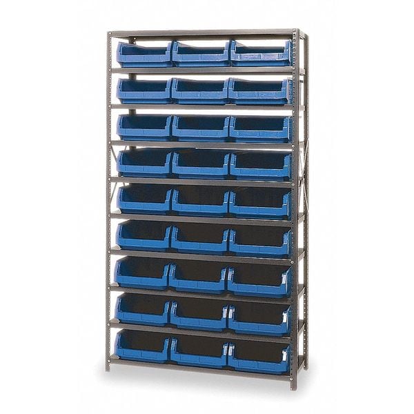 Bin Shelving, Bin Style Stacking, Bin Material Polyethylene, (27) 5 7/8 in x 12 3/8 in x 19 3/4 in Bin HxWxD, Bin Height 5 7/8 in, Bin Front Type Open, Bin Depth 19 3/4 in, Bin Color Blue, Frame Material Steel, NSF, Frame Color Gray, Powder Coated, Includes Bins Yes, Bin Width 12 3/8 in, Includes QMS531BL, Load Capacity per Shelf 350 lb, Number of Bins 27, Number of Shelves 10, Number of Usable Sides 1, Overall Depth 18 in, Overall Height 75 in, Overall Width 42 in, Powder Coated Shelf Finish