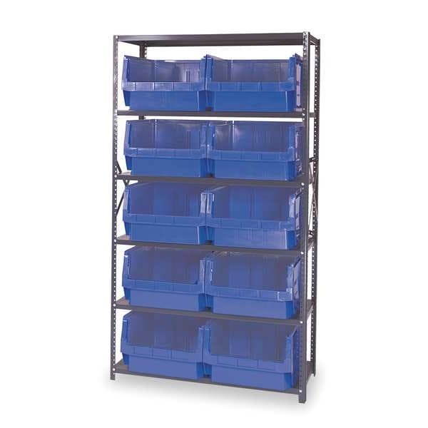 Bin Shelving, Bin Style Stacking, Bin Material Polyethylene, (10) 11 7/8 in x 18 3/8 in x 19 3/4 in Bin HxWxD, Bin Height 11 7/8 in, Bin Front Type Open, Bin Depth 19 3/4 in, Bin Color Blue, Frame Material Steel, NSF, Frame Color Gray, Powder Coated, Includes Bins Yes, Bin Width 18 3/8 in, Includes QMS543BL, Load Capacity per Shelf 350 lb, Number of Bins 10, Number of Shelves 6, Number of Usable Sides 1, Overall Depth 18 in, Overall Height 75 in, Overall Width 42 in, Powder Coated Shelf Finish