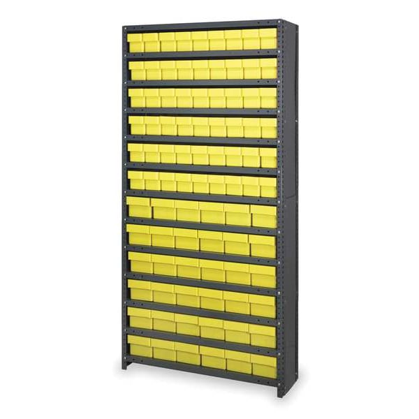 Enclosed Bin Shelving, Bin Style Drawer, Bin Material Polystyrene, (36) 4 5/8 in x 5 9/16 in x 17 7/8 in, (54) 4 5/8 in x 3 3/4 in x 17 7/8 in Bin HxWxD, Bin Height 4 5/8 in, Bin Front Type Closed, Bin Depth 17 7/8 in, Bin Color Yellow, Frame Material Steel, Frame Color Gray, Powder Coated, Includes Bins Yes, Bin Width 3 3/4 in, 5 9/16 in, Includes QED602YL, QED604YL, Load Capacity per Shelf 400 lb, Number of Bins 90, Number of Shelves 13, Number of Usable Sides 1, Overall Depth 18 in