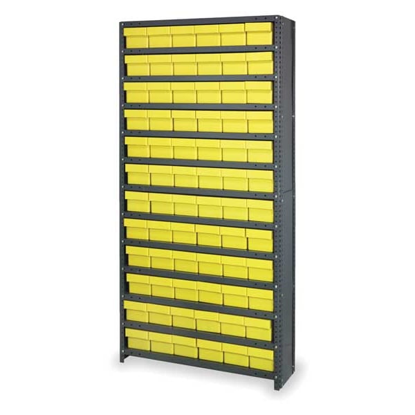 Enclosed Bin Shelving, Bin Style Drawer, Bin Material Polystyrene, (72) 4 5/8 in x 5 9/16 in x 23 7/8 in Bin HxWxD, Bin Height 4 5/8 in, Bin Front Type Closed, Bin Depth 23 7/8 in, Bin Color Yellow, Frame Material Steel, Frame Color Gray, Powder Coated, Includes Bins Yes, Bin Width 5 9/16 in, Includes QED603YL, Load Capacity per Shelf 400 lb, Number of Bins 72, Number of Shelves 13, Number of Usable Sides 1, Overall Depth 24 in, Overall Height 75 in, Overall Width 36 in