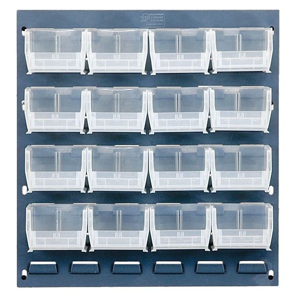 Louvered Panel, Bin Color Clear, Bin Depth 7 3/8 in, Bin Height 3 in, Bin Style Hang and Stack, Bin Width 4 1/8 in, Number of Bins 16, Overall Depth 1/4 in, Overall Height 20 in, Overall Width 18 in, 175 lb Whole Unit Load Capacity, Number of Sides 1, Gray, Powder Coated, Steel, Louvered Panel Louvered Rack Style, Model QLP-1819 Louvered Panel and Model QUS220 Bins