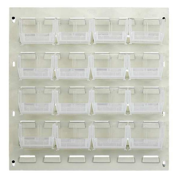 Louvered Panel, Bin Color Clear, Bin Depth 7 3/8 in, Bin Height 3 in, Bin Style Hang and Stack, Bin Width 4 1/8 in, Number of Bins 16, Overall Depth 1/4 in, Overall Height 20 in, Overall Width 18 in, 10 lb Whole Unit Load Capacity, Number of Sides 1, White, Powder Coated, Steel, Louvered Panel Louvered Rack Style, Model QLP-1819 Louvered Panel and Model QUS220 Bins