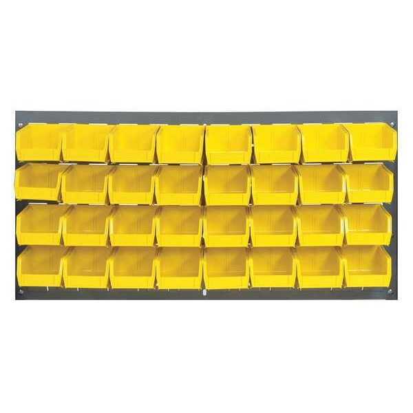Louvered Panel, Bin Color Yellow, Bin Depth 5 3/8 in, Bin Height 3 in, Bin Style Hang and Stack, Bin Width 4 1/8 in, Number of Bins 32, Overall Depth 1/4 in, Overall Height 20 in, Overall Width 36 in, 175 lb Whole Unit Load Capacity, Number of Sides 1, Gray, Powder Coated, Steel, Louvered Panel Louvered Rack Style, Model QLP-3619 Louvered Panel and Model QUS210CL Bins