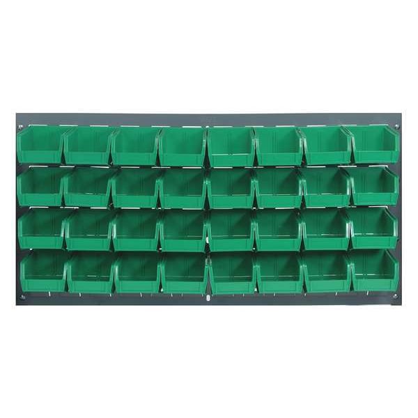 Louvered Panel, Bin Color Green, Bin Depth 7 3/8 in, Bin Height 3 in, Bin Style Hang and Stack, Bin Width 4 1/8 in, Number of Bins 32, Overall Depth 1/4 in, Overall Height 20 in, Overall Width 36 in, 175 lb Whole Unit Load Capacity, Number of Sides 1, Gray, Powder Coated, Steel, Louvered Panel Louvered Rack Style, Model QLP-3619 Louvered Panel and Model QUS220 Bins