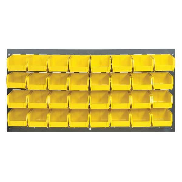 Louvered Panel, Bin Color Yellow, Bin Depth 7 3/8 in, Bin Height 3 in, Bin Style Hang and Stack, Bin Width 4 1/8 in, Number of Bins 32, Overall Depth 1/4 in, Overall Height 20 in, Overall Width 36 in, 175 lb Whole Unit Load Capacity, Number of Sides 1, Gray, Powder Coated, Steel, Louvered Panel Louvered Rack Style, Model QLP-3619 Louvered Panel and Model QUS220 Bins