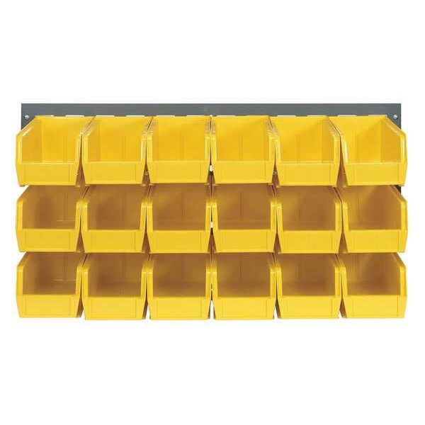 Louvered Panel, Bin Color Yellow, Bin Depth 10 7/8 in, Bin Height 5 in, Bin Style Hang and Stack, Bin Width 5 1/2 in, Number of Bins 18, Overall Depth 1/4 in, Overall Height 20 in, Overall Width 36 in, 175 lb Whole Unit Load Capacity, Number of Sides 1, Gray, Powder Coated, Steel, Louvered Panel Louvered Rack Style, Model QLP-3619 Louvered Panel, Model QUS230 Bins