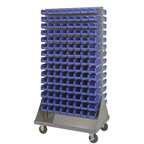 Mobile Louvered Floor Rack, Bin Color Blue, Bin Depth 7 3/8 in, Bin Height 3 in, Bin Style Hang and Stack, Bin Width 4 1/8 in, Number of Bins 240, For Maximum Number of Bins 240, Caster Wheel/Configuration (2) Rigid, (2) Swivel, Caster Wheel Diameter 5 in, Caster Wheel/Tread Material Hard Rubber, Steel, Powder Coated, Gray, Number of Sides 2, Overall Depth 24 in, Overall Height 72 in, Overall Width 36 in, Whole Unit Load Capacity 1,200 lb, Frame Configuration Vertical