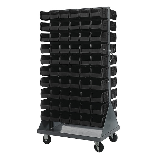 Mobile Louvered Floor Rack, Bin Color Black, Bin Depth 10 7/8 in, Bin Height 5 in, Bin Style Hang and Stack, Bin Width 5 1/2 in, Number of Bins 120, For Maximum Number of Bins 120, Caster Wheel/Configuration (2) Rigid, (2) Swivel, Caster Wheel Diameter 5 in, Caster Wheel/Tread Material Hard Rubber, Steel, Powder Coated, Gray, Number of Sides 2, Overall Depth 24 in, Overall Height 72 in, Overall Width 36 in, Whole Unit Load Capacity 1,200 lb, Frame Configuration Vertical