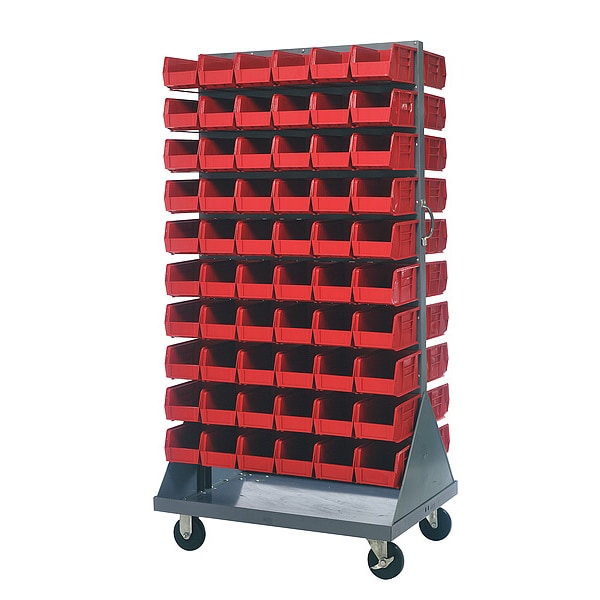 Mobile Louvered Floor Rack, Bin Color Red, Bin Depth 10 7/8 in, Bin Height 5 in, Bin Style Hang and Stack, Bin Width 5 1/2 in, Number of Bins 120, For Maximum Number of Bins 120, Caster Wheel/Configuration (2) Rigid, (2) Swivel, Caster Wheel Diameter 5 in, Caster Wheel/Tread Material Hard Rubber, Steel, Powder Coated, Gray, Number of Sides 2, Overall Depth 24 in, Overall Height 72 in, Overall Width 36 in, Whole Unit Load Capacity 1,200 lb, Frame Configuration Vertical