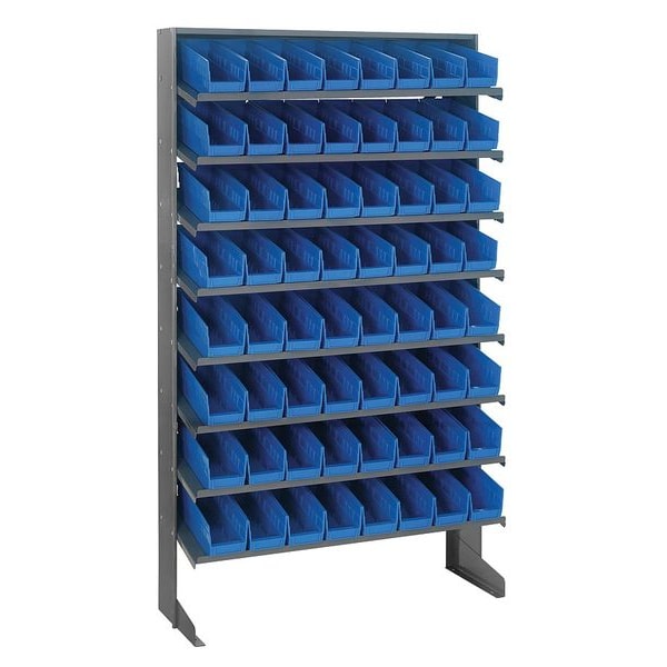 Pick Rack, Bin Style Shelf, Bin Material Polypropylene, (64) 6 in x 4 1/8 in x 11 5/8 in Bin HxWxD, Bin Height 6 in, Bin Front Type Open, Bin Depth 11 5/8 in, Bin Color Blue, Frame Material Steel, Frame Color Gray, Powder Coated, Includes Bins Yes, Bin Width 4 1/8 in, Load Capacity per Shelf 50 lb, Number of Bins 64, Number of Shelves 8, Number of Usable Sides 1, Overall Depth 12 in, Overall Height 64 in, Overall Width 36 in, Powder Coated Shelf Finish, Steel Shelf Material, No