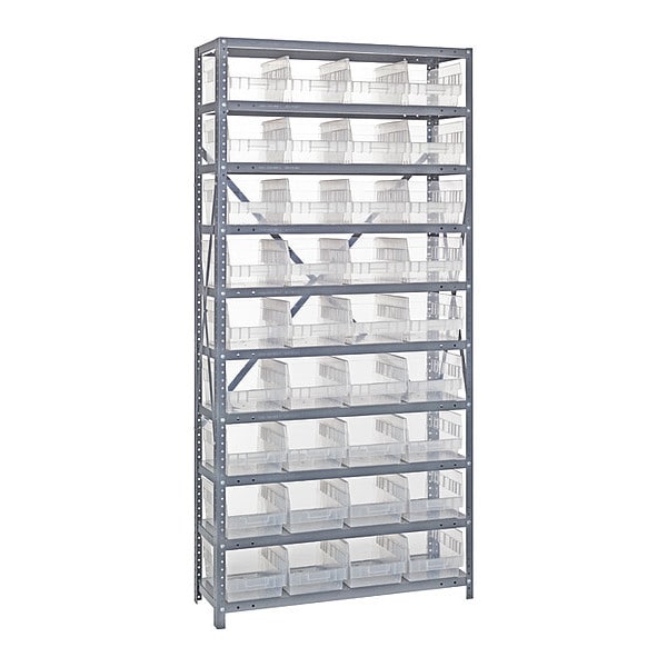 Pick Rack, Bin Style Shelf, Bin Material Polypropylene, (36) 6 in x 8 3/8 in x 17 7/8 in Bin HxWxD, Bin Height 6 in, Bin Front Type Open, Bin Depth 17 7/8 in, Bin Color Clear, Frame Material Steel, FDA Approved, Frame Color Gray, Powder Coated, Includes Bins Yes, Bin Width 8 3/8 in, Includes QSB208CL, Load Capacity per Shelf 40 lb, Number of Bins 36, Number of Shelves 10, Number of Usable Sides 1, Overall Depth 18 in, Overall Height 75 in, Overall Width 36 in, Powder Coated Shelf Finish