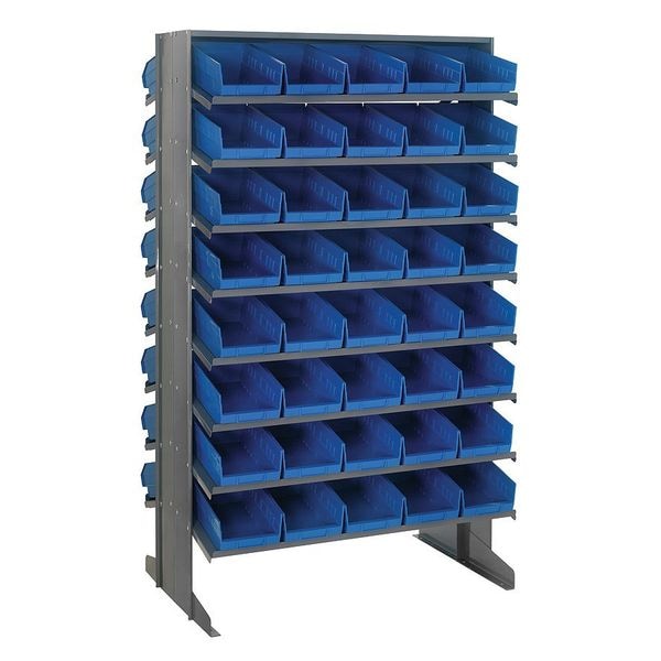 Pick Rack, Bin Style Shelf, Bin Material Polypropylene, (80) 6 in x 6 5/8 in x 11 5/8 in Bin HxWxD, Bin Height 6 in, Bin Front Type Open, Bin Depth 11 5/8 in, Bin Color Blue, Frame Material Steel, Frame Color Gray, Powder Coated, Includes Bins Yes, Bin Width 6 5/8 in, Includes Double Pick Rack, Load Capacity per Shelf 50 lb, Number of Bins 80, Number of Shelves 16, Number of Usable Sides 2, Overall Depth 24 in, Overall Height 64 in, Overall Width 36 in, Powder Coated Shelf Finish