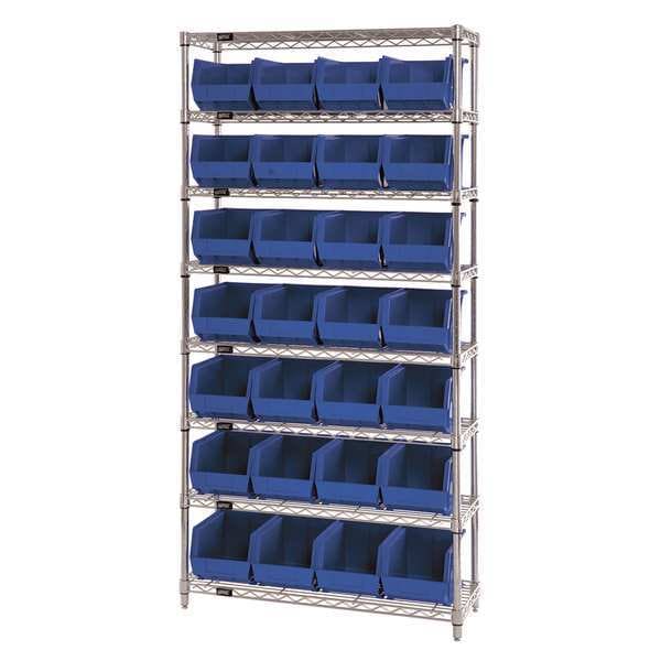 Bin Shelving, Bin Style Hang and Stack, Bin Material Polypropylene, (28) 7 in x 8 1/4 in x 10 3/4 in Bin HxWxD, Bin Height 7 in, Bin Front Type Open, Bin Depth 10 3/4 in, Bin Color Blue, Frame Material Steel, FDA Approved, Frame Color Silver, Chrome, Includes Bins Yes, Bin Width 8 1/4 in, Includes QUS239BL, Load Capacity per Shelf 800 lb, Number of Bins 28, Number of Shelves 8, Number of Usable Sides 1, Overall Depth 12 in, Overall Height 74 in, Overall Width 36 in, Chrome Shelf Finish