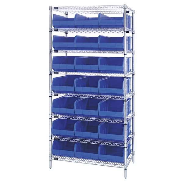 Bin Shelving, Bin Style Shelf, Bin Material Polypropylene, (21) 7 in x 11 in x 12 in Bin HxWxD, Bin Height 7 in, Bin Front Type Open, Bin Depth 12 in, Bin Color Blue, Frame Material Steel, FDA Approved, Frame Color Silver, Chrome, Includes Bins Yes, Bin Width 11 in, Includes SSB425BL, Load Capacity per Shelf 800 lb, Number of Bins 21, Number of Shelves 8, Number of Usable Sides 1, Overall Depth 12 in, Overall Height 75 in, Overall Width 36 in, Chrome Shelf Finish, Steel Shelf Material, No