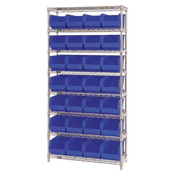 Bin Shelving, Bin Style Hang and Stack, Bin Material Polypropylene, (28) 7 in x 8 1/4 in x 14 3/4 in Bin HxWxD, Bin Height 7 in, Bin Front Type Open, Bin Depth 14 3/4 in, Bin Color Blue, Frame Material Steel, FDA Approved, Frame Color Silver, Chrome, Includes Bins Yes, Bin Width 8 1/4 in, Includes QUS240BL, Load Capacity per Shelf 800 lb, Number of Bins 28, Number of Shelves 8, Number of Usable Sides 1, Overall Depth 14 in, Overall Height 74 in, Overall Width 36 in, Chrome Shelf Finish