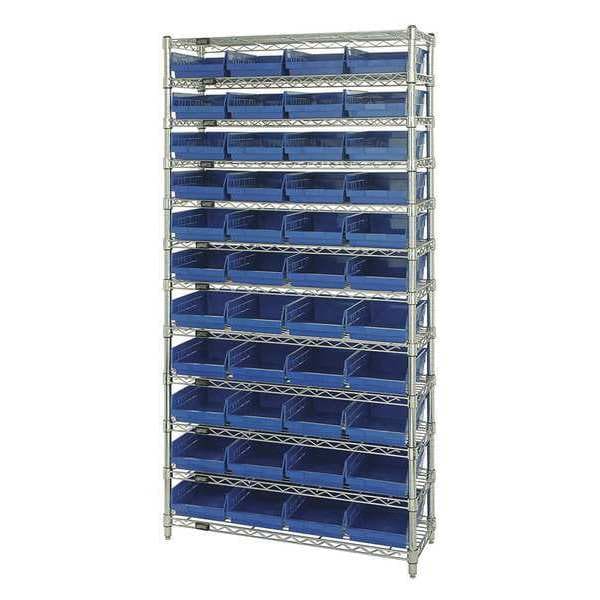 Bin Shelving, Bin Style Shelf, Bin Material Polypropylene, (44) 4 in x 8 3/8 in x 17 7/8 in Bin HxWxD, Bin Height 4 in, Bin Front Type Open, Bin Depth 17 7/8 in, Bin Color Blue, Frame Material Steel, NSF, Frame Color Silver, Chrome, Includes Bins Yes, Bin Width 8 3/8 in, Includes QSB108BL, Load Capacity per Shelf 800 lb, Number of Bins 44, Number of Shelves 12, Number of Usable Sides 1, Overall Depth 18 in, Overall Height 74 in, Overall Width 36 in, Chrome Shelf Finish, Steel Shelf Material, No