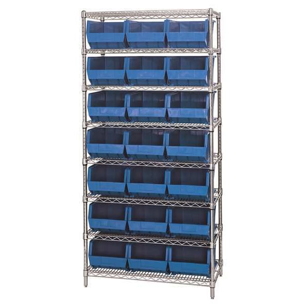 Bin Shelving, Bin Style Hang and Stack, Bin Material Polypropylene, (21) 8 in x 11 in x 16 in Bin HxWxD, Bin Height 8 in, Bin Front Type Open, Bin Depth 16 in, Bin Color Blue, Frame Material Steel, FDA Approved, Frame Color Silver, Chrome, Includes Bins Yes, Bin Width 11 in, Includes QUS255BL, Load Capacity per Shelf 800 lb, Number of Bins 21, Number of Shelves 8, Number of Usable Sides 1, Overall Depth 18 in, Overall Height 74 in, Overall Width 36 in, Chrome Shelf Finish, Steel Shelf Material