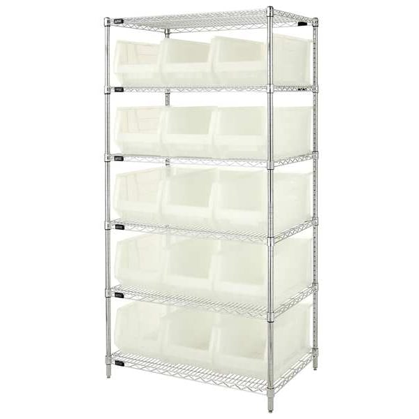 Bin Shelving, Bin Style Hang and Stack, Bin Material Polypropylene, (15) 10 in x 11 in x 23 7/8 in Bin HxWxD, Bin Height 10 in, Bin Front Type Open, Bin Depth 23 7/8 in, Bin Color Clear, Frame Material Steel, NSF, Frame Color Silver, Chrome, Includes Bins Yes, Bin Width 11 in, Includes QUS953CL, Load Capacity per Shelf 800 lb, Number of Bins 15, Number of Shelves 6, Number of Usable Sides 1, Overall Depth 24 in, Overall Height 74 in, Overall Width 36 in, Chrome Shelf Finish, Steel Shelf Material