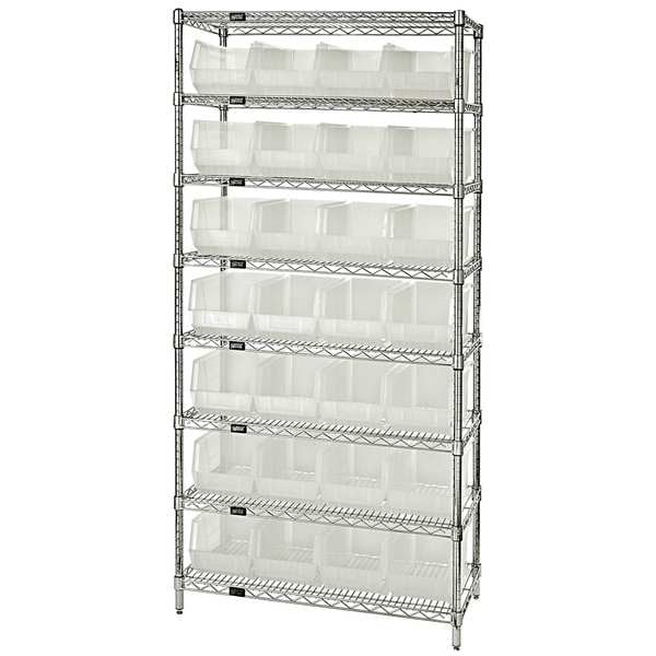 Bin Shelving, Bin Style Hang and Stack, Bin Material Polypropylene, (28) 7 in x 8 1/4 in x 23 7/8 in Bin HxWxD, Bin Height 7 in, Bin Front Type Open, Bin Depth 23 7/8 in, Bin Color Clear, Frame Material Steel, NSF, Frame Color Silver, Chrome, Includes Bins Yes, Bin Width 8 1/4 in, Includes QUS950CL, Load Capacity per Shelf 800 lb, Number of Bins 28, Number of Shelves 8, Number of Usable Sides 1, Overall Depth 24 in, Overall Height 74 in, Overall Width 36 in, Chrome Shelf Finish