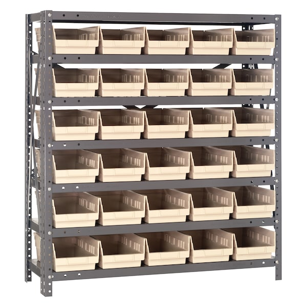 Economical small parts storage steel systems keep parts easily accessible. Open hopper front bins with label area provide fast access to store items. This all-in-one unit is easy to clean and will not rust or corrode. Heavy-duty, high grade shelving offers 400 lb. capacity per shelf. 36” wide shelving has a smooth powder coat finish. Bins re available in 7 colors.